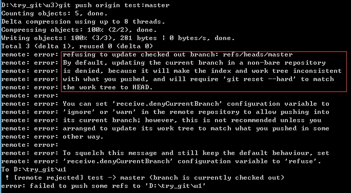 但是如果你要推送到master分支会报错(因为u1的当前分支是master):