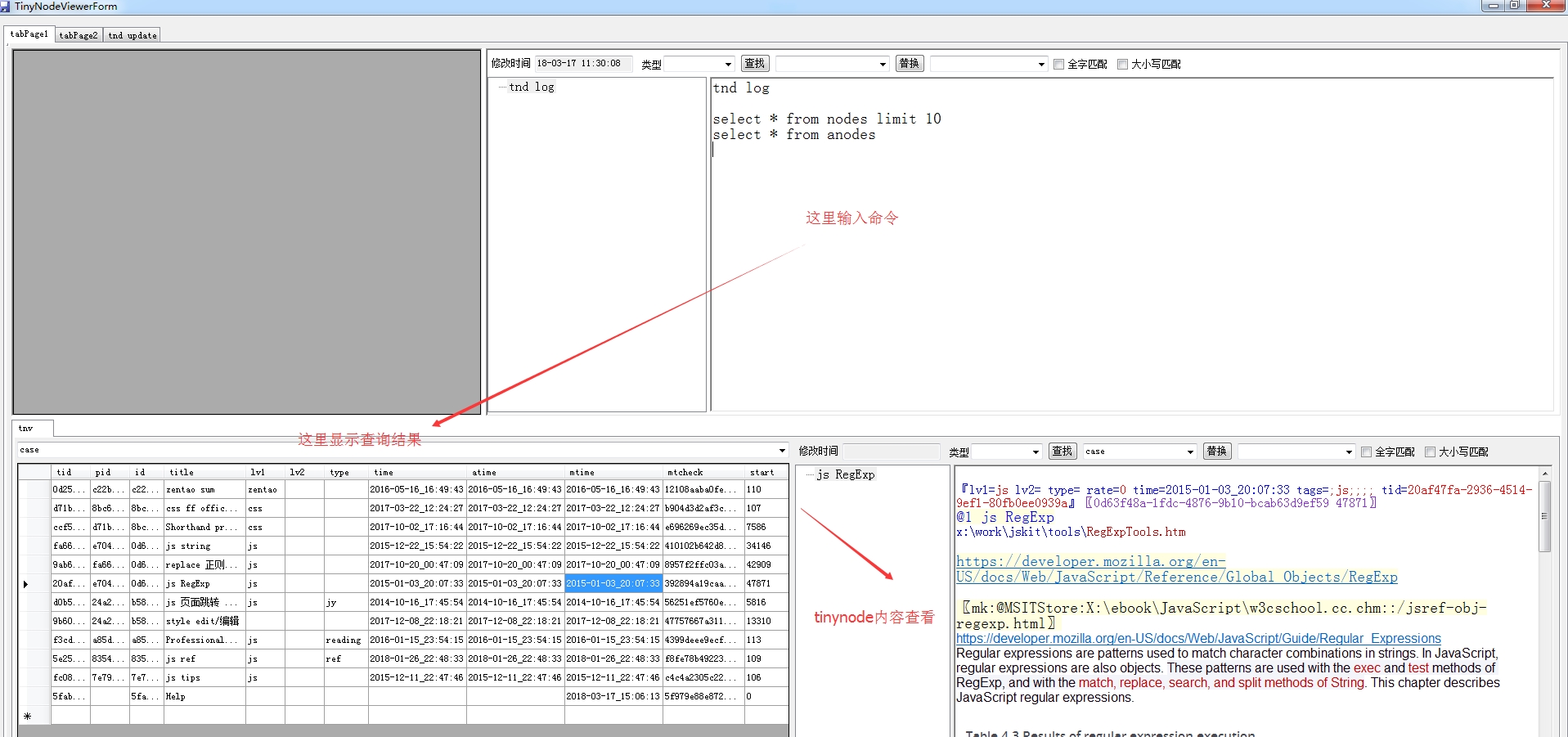 每个tinynode的所有属性将构成一条记录存入数据库中。可以在tnv:tiny node viewer 中通过sql语句进行查询。后面将提供更多的UI界面方便查询操作。